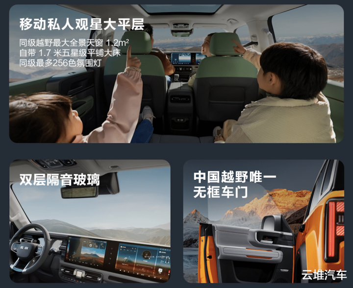 差异化配置:配备无框车门、双12.8英寸联屏、1.2㎡全景天窗(厂家称同级越野最大)、256色氛围灯等,兼顾一定舒适性与科技感。