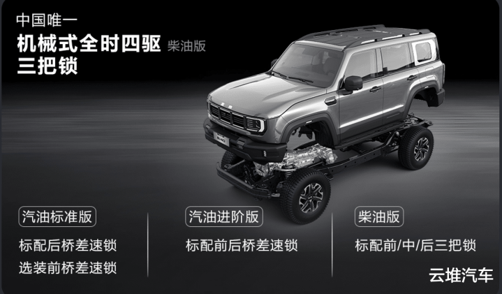 驱动系统:柴油版搭载较为少见的机械式全时四驱系统,配合三把差速锁,提升复杂路况脱困能力。其4.0大速比分动器设计旨在放大扭矩输出。